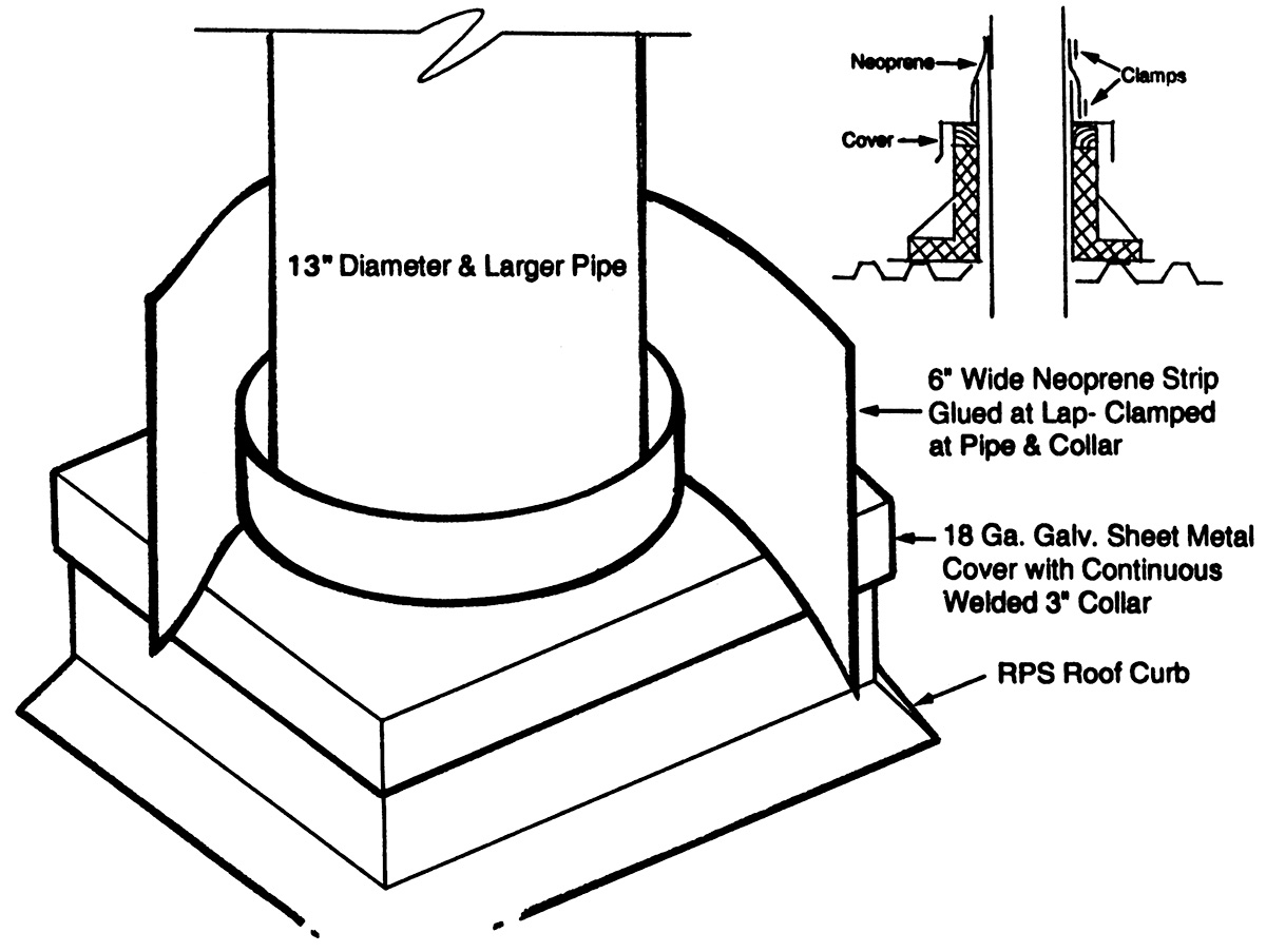 The Special Pipe Portal Systems Large Openings is a heavy-duty roof curb assembly designed for large pipe penetrations in metal roofing. Built from 18-gauge galvanized steel with integrated wood nailer, galvanized cover, neoprene wrap, and dual stainless steel clamps, this system delivers a secure, corrosion-resistant, water-tight installation for commercial and industrial applications.